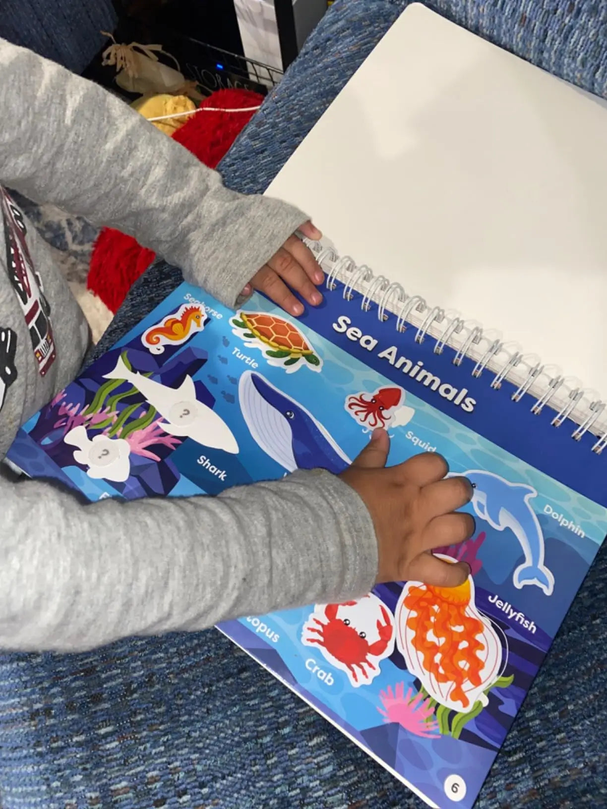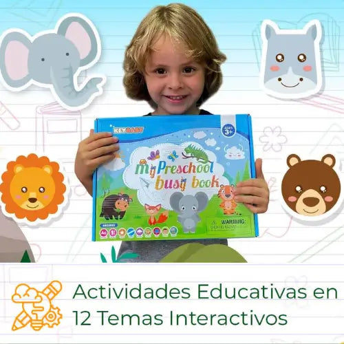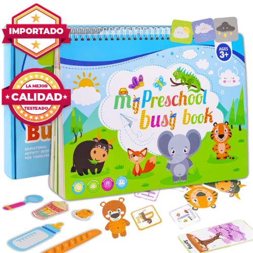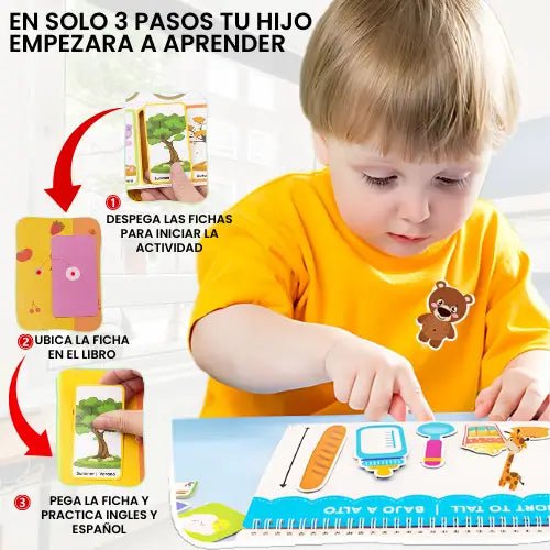 Nuestro Genius Book™ Bilingüe es un libro de actividades interactivo con sistema de velcro patentado, diseñado específicamente para niños de 3-10 años. Combina 12 temas educativos esenciales (letras, números, formas, colores, animales, etc.) en español e inglés, permitiendo que los niños aprendan +180 palabras en ambos idiomas mientras desarrollan habilidades motoras finas y cognitivas y lo mejor olvidando el caos que es el aprendizaje común!