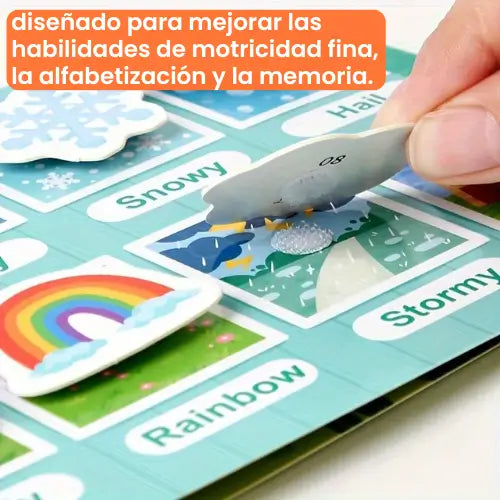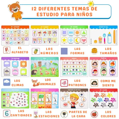 con sistema de velcro de alta resistencia y 12 temas educativos completos (letras, números, formas, tamaños, clima, animales, patrones, sentimientos, conteo, estaciones, reconocimiento facial y colores).