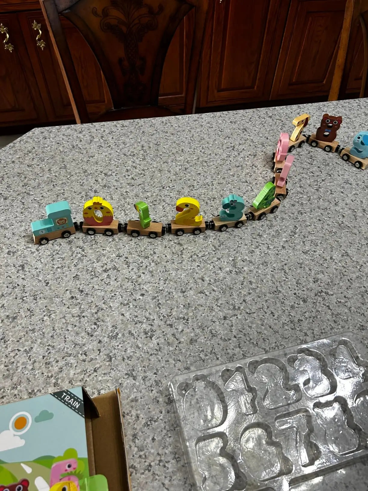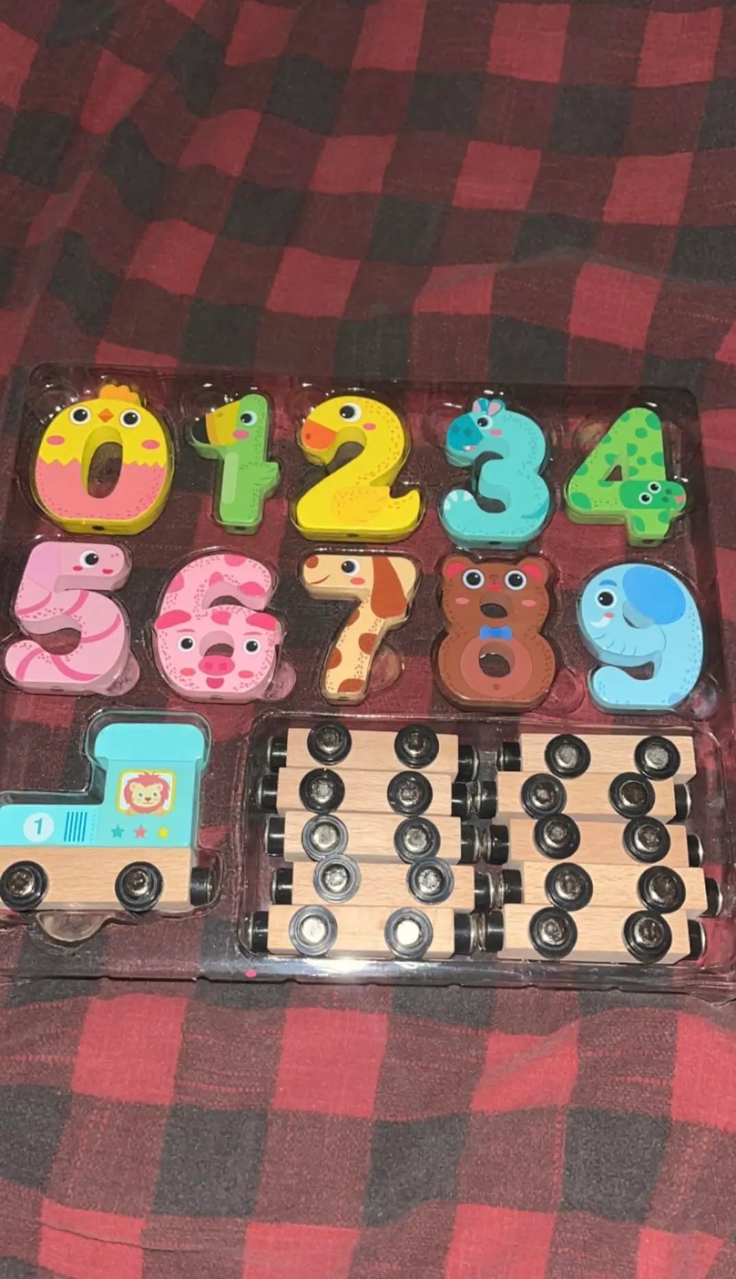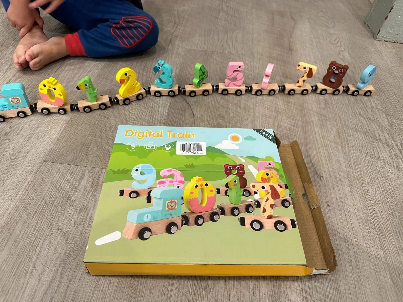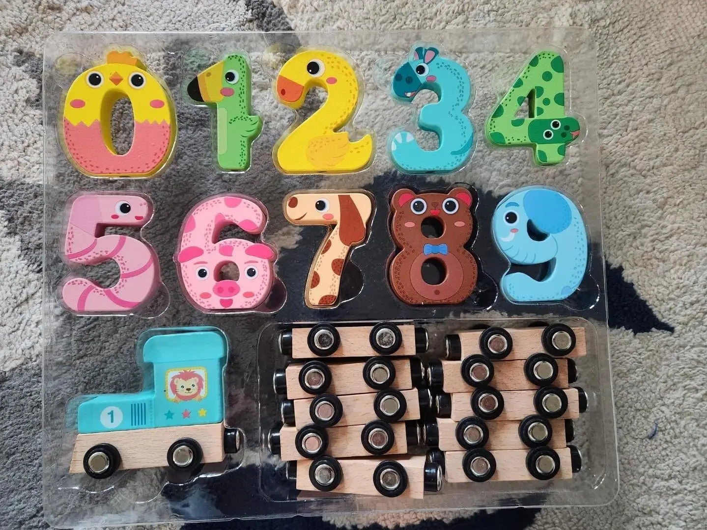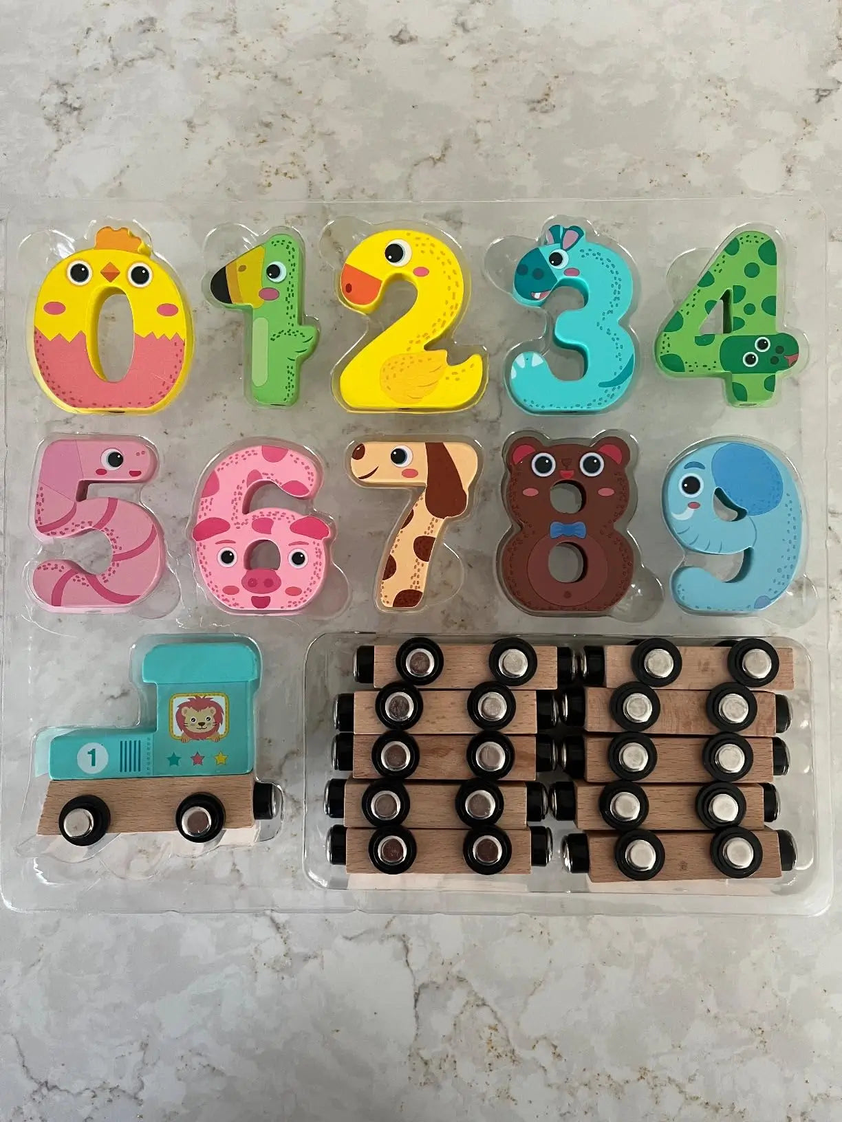 Tren de madera educativa con 21 vagones numerados (0–9), con imanes resistentes para conectividad segura, pintura al agua no tóxica. Favorece la enseñanza de números, colores, coordinación motriz y concentración.